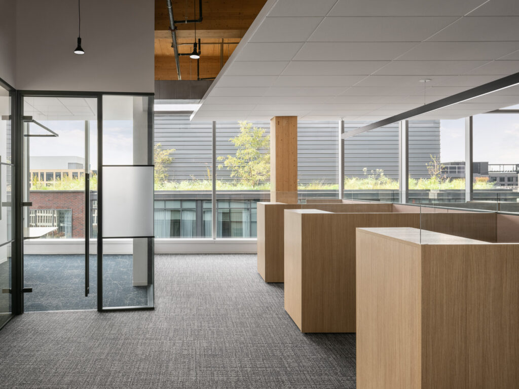 In addition to the 170 Haworth workstations and private offices, Price Modern worked with OTJ to select ancillary items that would encourage staff to engage and collaborate with one another. This includes several lounge spaces and a large breakout area adjacent to the pantry, complete with a custom 20-foot table to invite staff and visitors to connect in a comfortable environment. The breakout area flows directly into the large multi-purpose conference center for ATA to host stakeholders and legislators. As part of the relocation, ATA desired a state-of-the-art broadcast room to share news and updates with its members. Not only did our team provide furniture solutions, but we also specified area rugs and carpet tile in select areas to instill a sense of warmth while reducing noise in the largely open spaces. The new ATA headquarters will ensure the organization can continue to advance the trucking industry and serve its staff, members, and stakeholders for years to come.