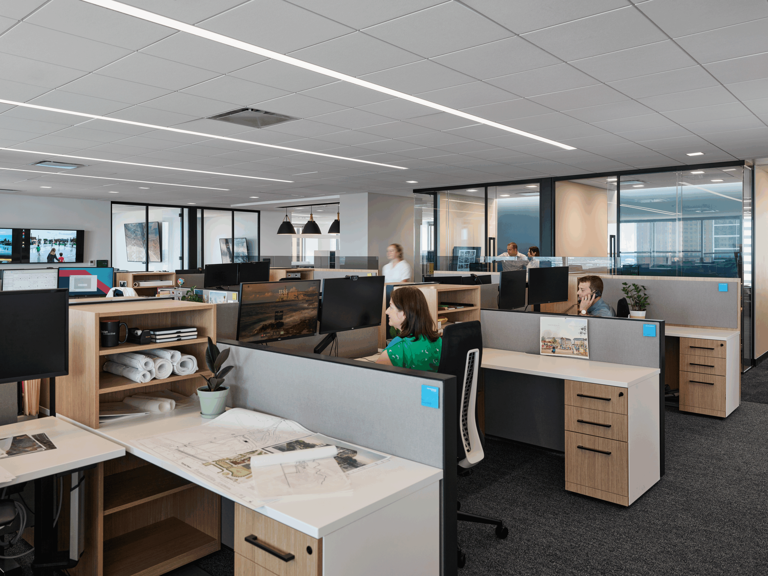 windows overlooking the harbor. To achieve this, our team specified workstations with glass partitions to ensure