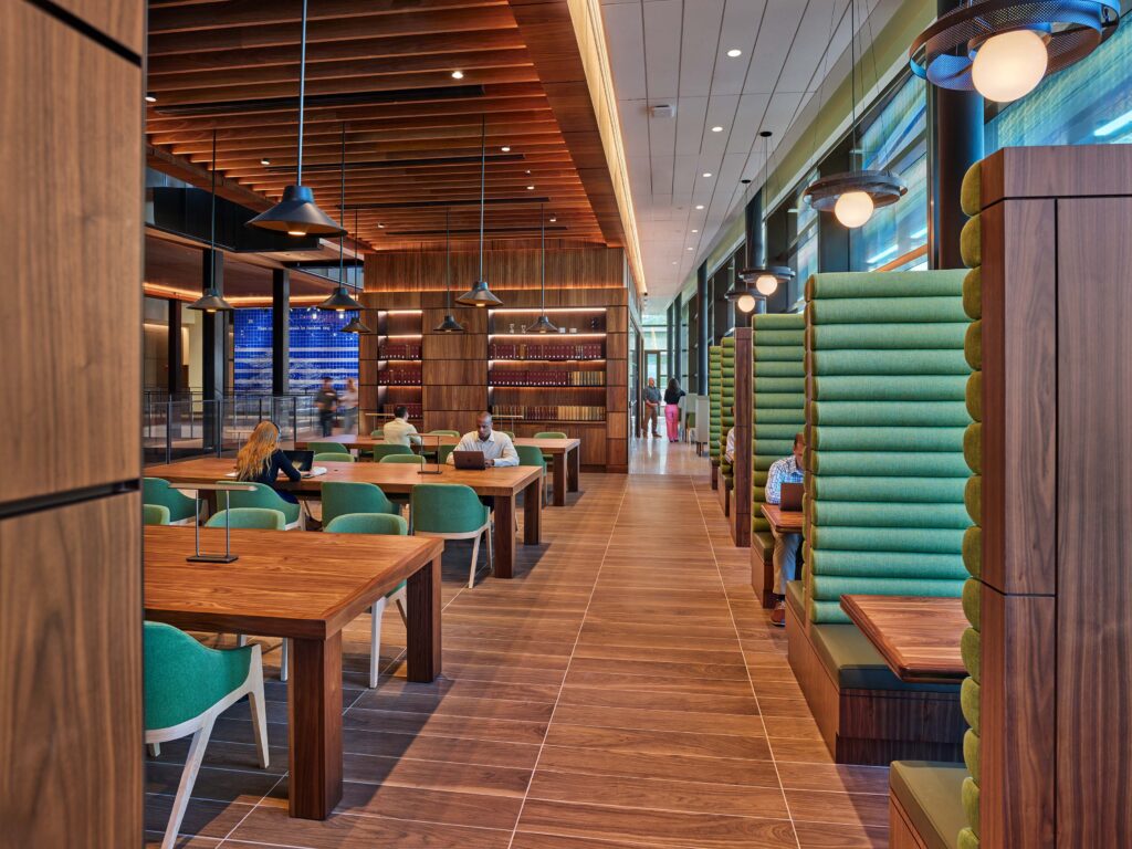 One of the most visible and utilized spaces in the building is The Beach, the central gathering space seen in the atrium. This open area includes a variety of lounge furniture including custom banquettes that sit along the central stairway. Additional spaces we furnished include casual collaborative areas, conference rooms of all sizes, a large conference center, huddle rooms, 38 classrooms, a library, and rooftop terrace with views of the Capitol Building. Coordinating the furniture design, procurement, delivery, and installation, Price Modern’s close partnership with Rockwell Group ensured we brought their vision to life with a seamless process from start to finish.