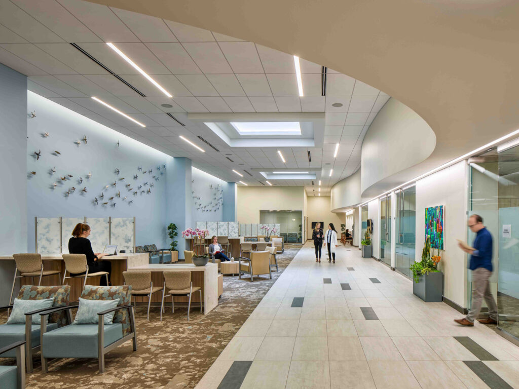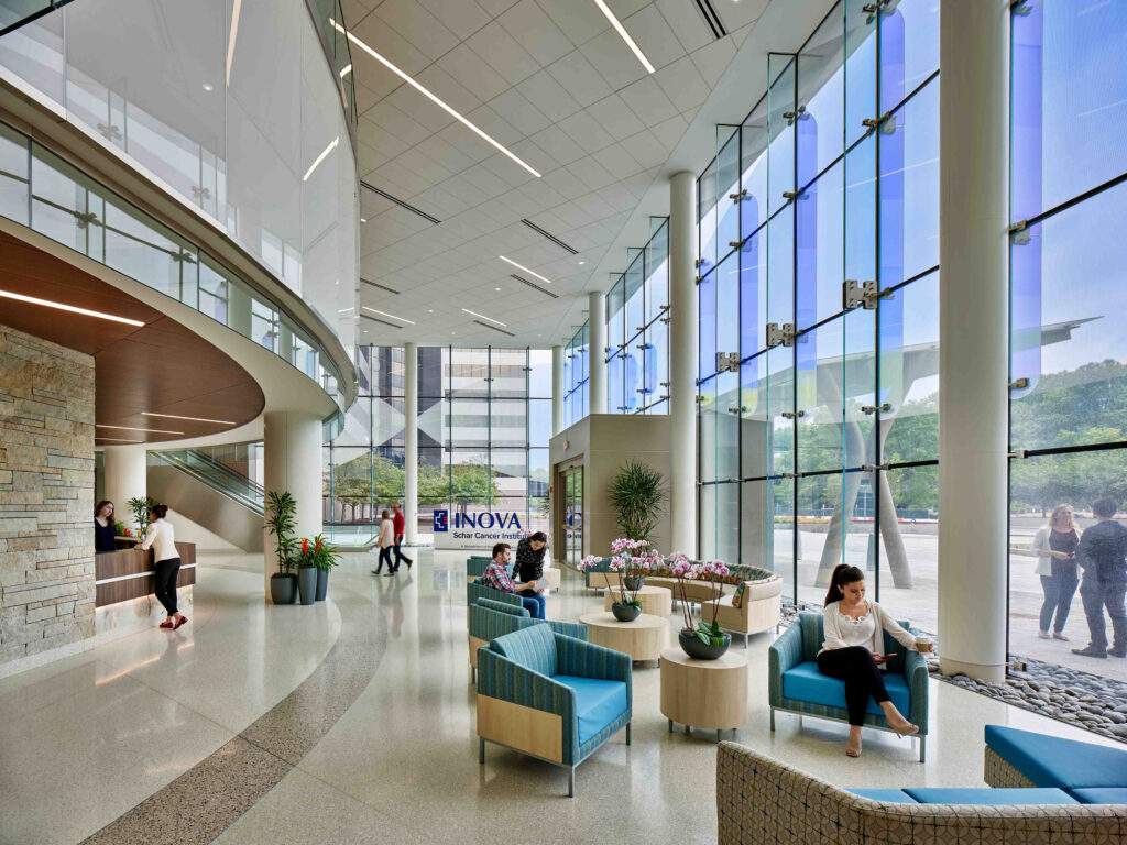 Situated on the former ExxonMobil campus, Inova enlisted Wilmot Sanz and Price Modern to help envision a new cancer institute that would bring together a variety of disciplines, including oncology, surgery, radiation, and more. The goal for the new facility was to simplify the already difficult process for patients as they navigate their cancer journey.