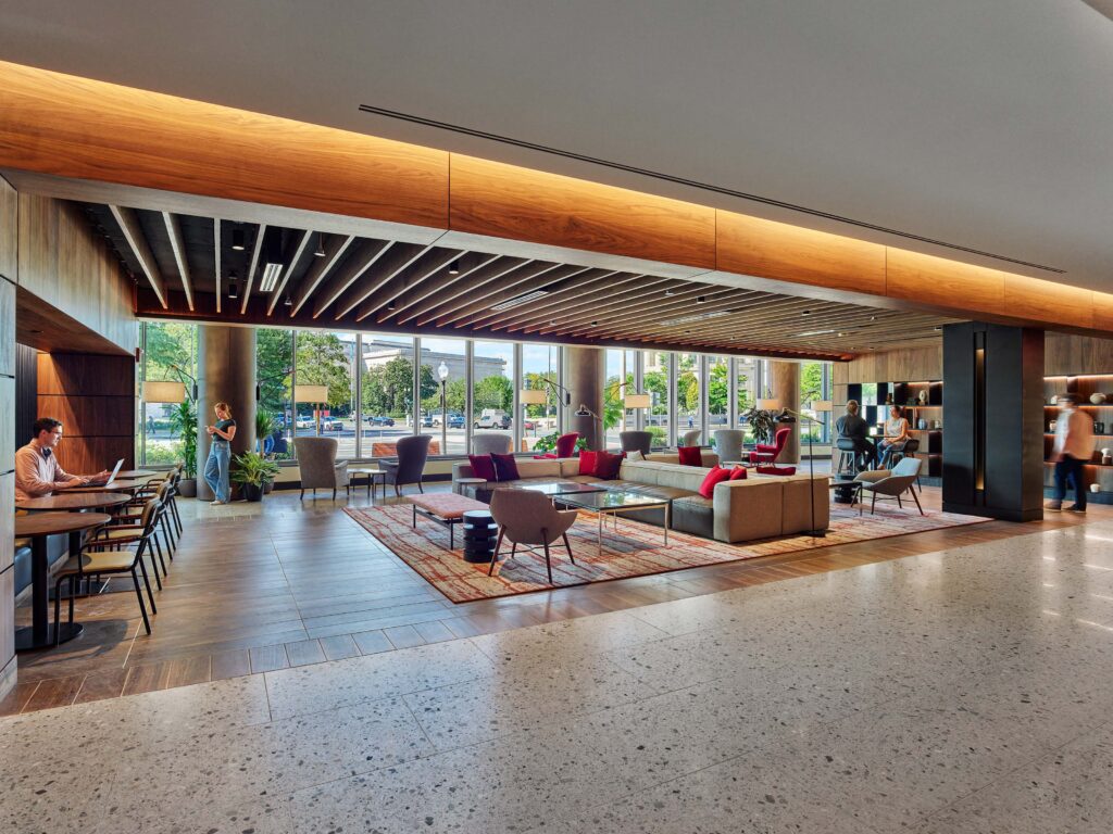 One of the most visible and utilized spaces in the building is The Beach, the central gathering space seen in the atrium. This open area includes a variety of lounge furniture including custom banquettes that sit along the central stairway. Additional spaces we furnished include casual collaborative areas, conference rooms of all sizes, a large conference center, huddle rooms, 38 classrooms, a library, and rooftop terrace with views of the Capitol Building. Coordinating the furniture design, procurement, delivery, and installation, Price Modern’s close partnership with Rockwell Group ensured we brought their vision to life with a seamless process from start to finish.